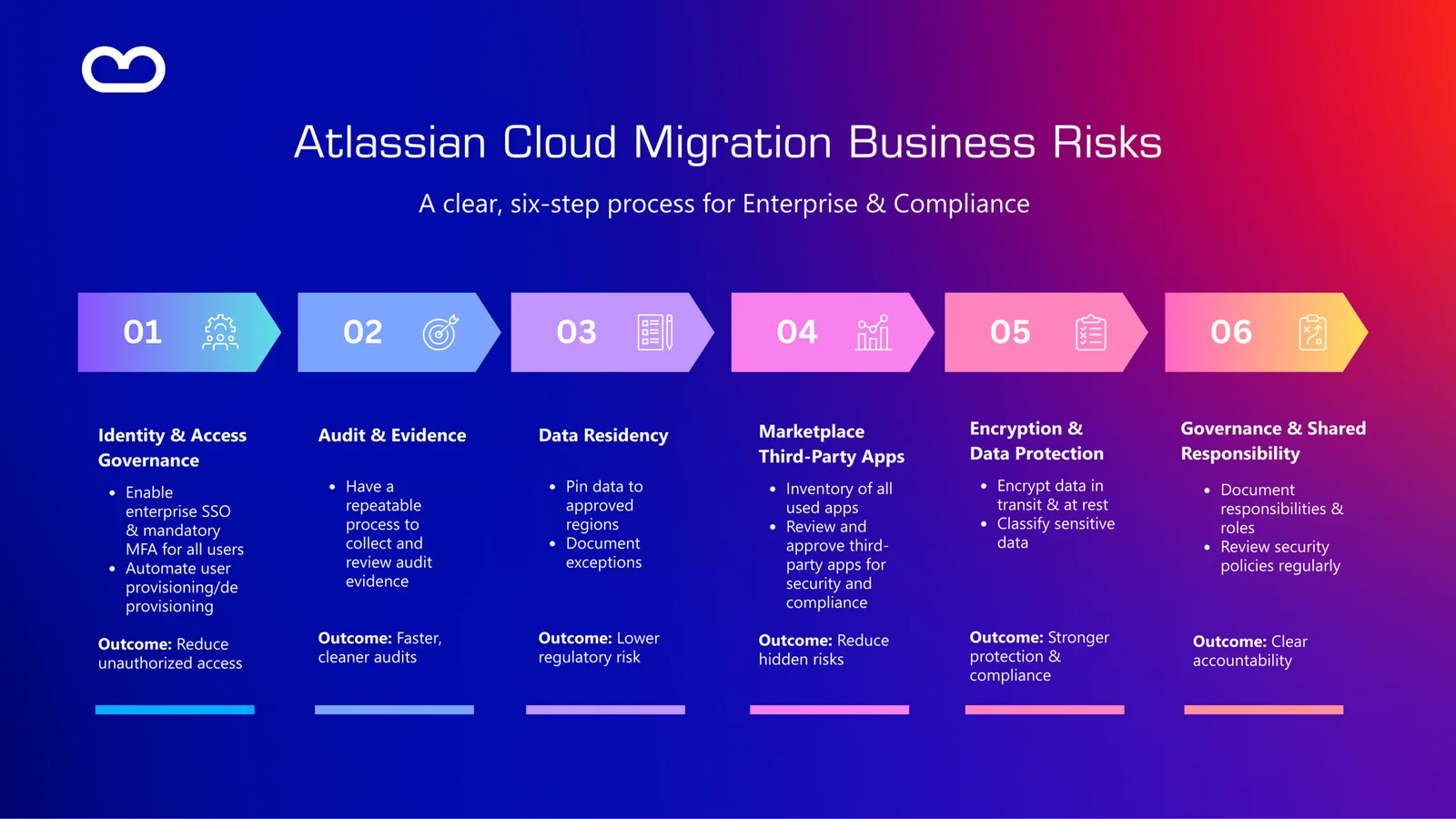 Migrating from Atlassian Data Center to Cloud changes your risk landscape: Atlassian handles infrastructure, but identity, audit, data residency, and third-party apps remain your responsibility. This guide translates technical controls into business-risk language, helping executives understand the compliance, operational, and regulatory impacts. Learn how to align Atlassian Cloud security with boardroom priorities and enterprise risk management.