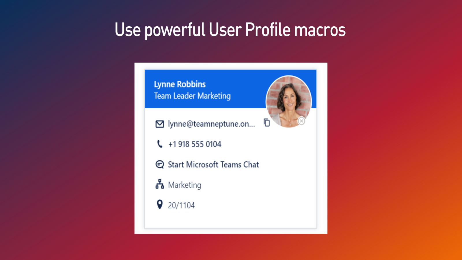 Detailed User Profiles: Automatically syncs contact details, roles, and location from Microsoft 365, giving you an up-to-date view of your colleagues.