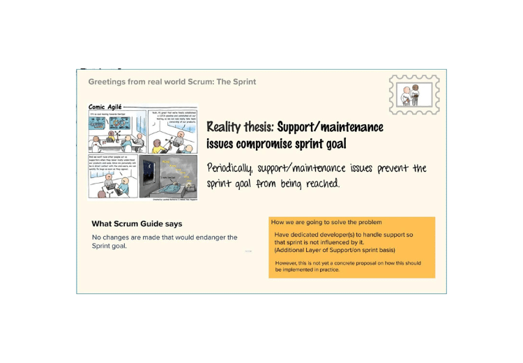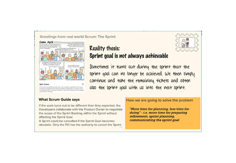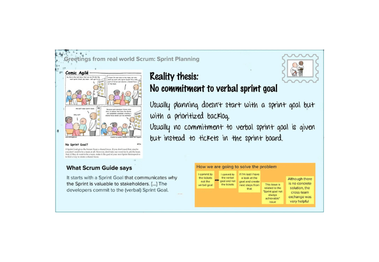 But how should we motivate the participants? After some thinking, we came up with the following approach: Before the workshop, we collected gaps or deviations from various team members’ perspectives and transformed them into “postcards”. In the workshop, we started telling a “Story of Scrum” that travels around the world and writes a postcard (“Greetings from real-world Scrum”) whenever it spots a flaw somewhere. And then it was the turn of the participants. After choosing a few topics (postcards) to be worked on based on voting, we jumped into group sessions and the group members worked on specific topics they were interested in. The groups worked on the topics trying to answer questions like: