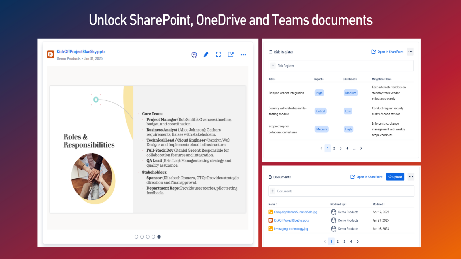 - Real-time updates with data securely managed within SharePoint, by connecting responsibly and respecting all permissions.