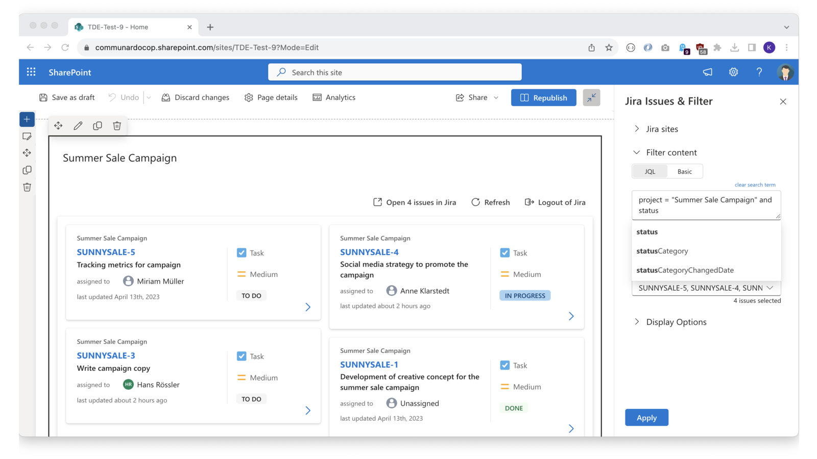 The app also allows you to bring Jira issues into SharePoint. You can view these issues in a format that suits you-whether it's a table or card view-and enjoy automatic updates that keep everything in sync. With Jira filters working seamlessly in SharePoint, finding the most important issues is quick and easy.
