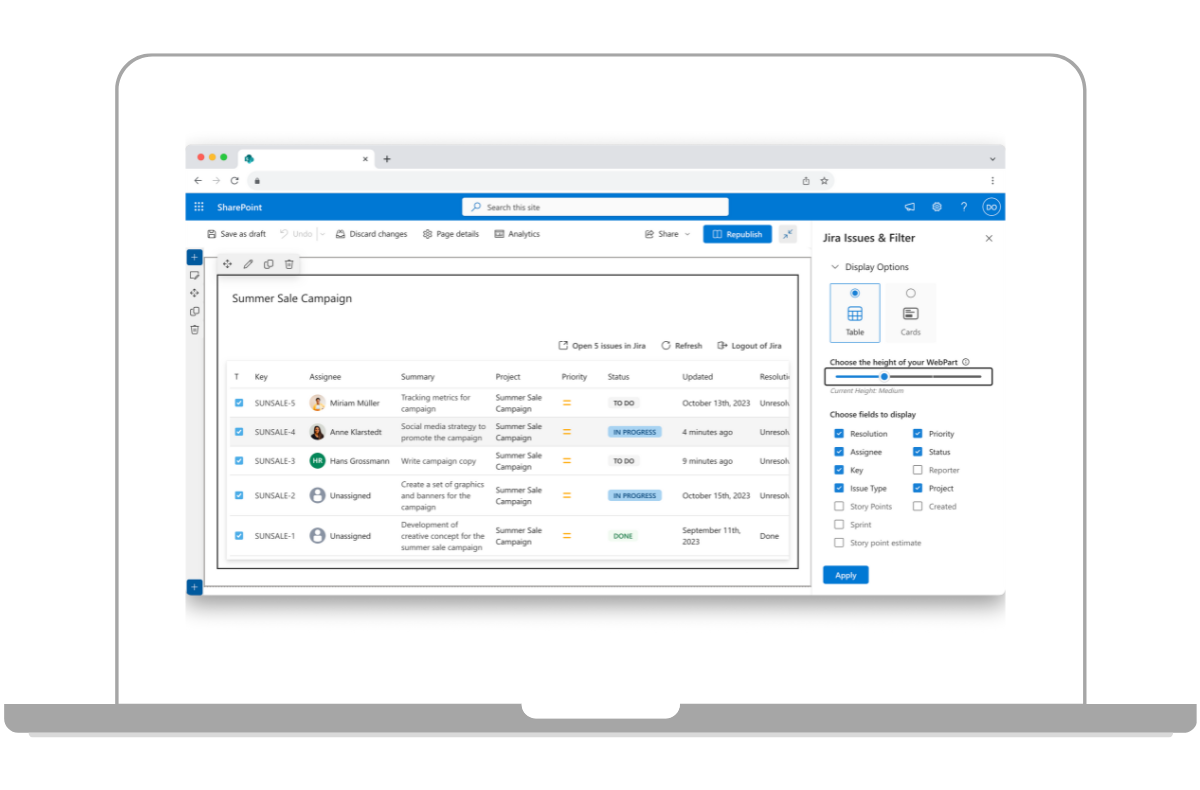 Jira’s strengths lie in task tracking. With the integration, users can access Jira Issues from SharePoint and stay informed on task updates without needing to switch between tools.