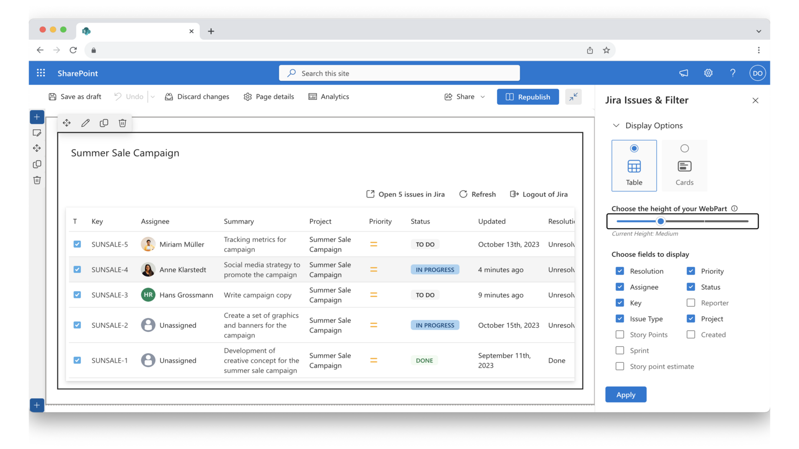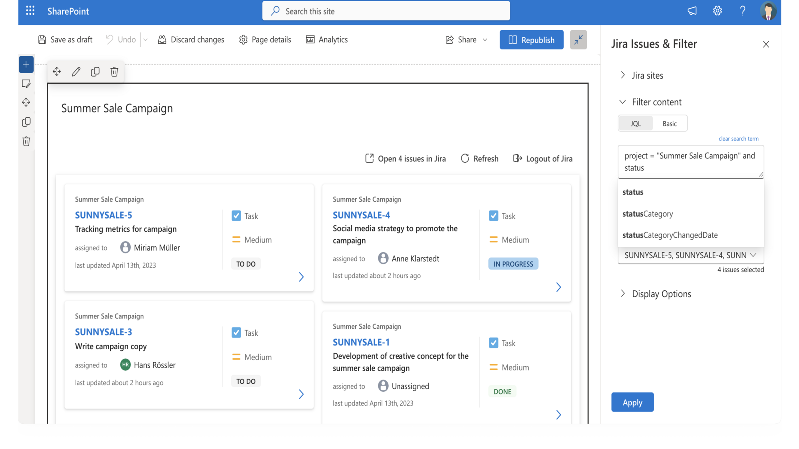 Jira’s strengths lie in task tracking. With the integration, users can access Jira Issues from SharePoint and stay informed on task updates without needing to switch between tools.