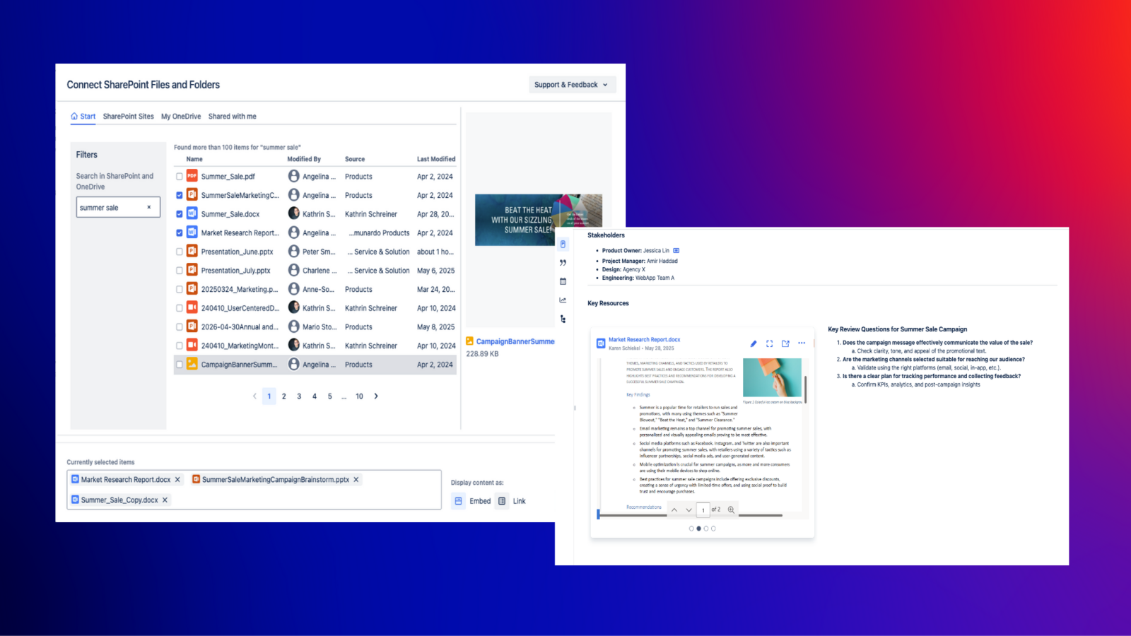 This app enables you to easily embed and display SharePoint content directly within Confluence pages, eliminating the need to duplicate files, manually track versions, or deal with scattered information. And with the latest release, users benefit from an improved UI, a faster experience powered by the Microsoft Graph API, and a range of new features designed to make cross-platform collaboration smoother and smarter.