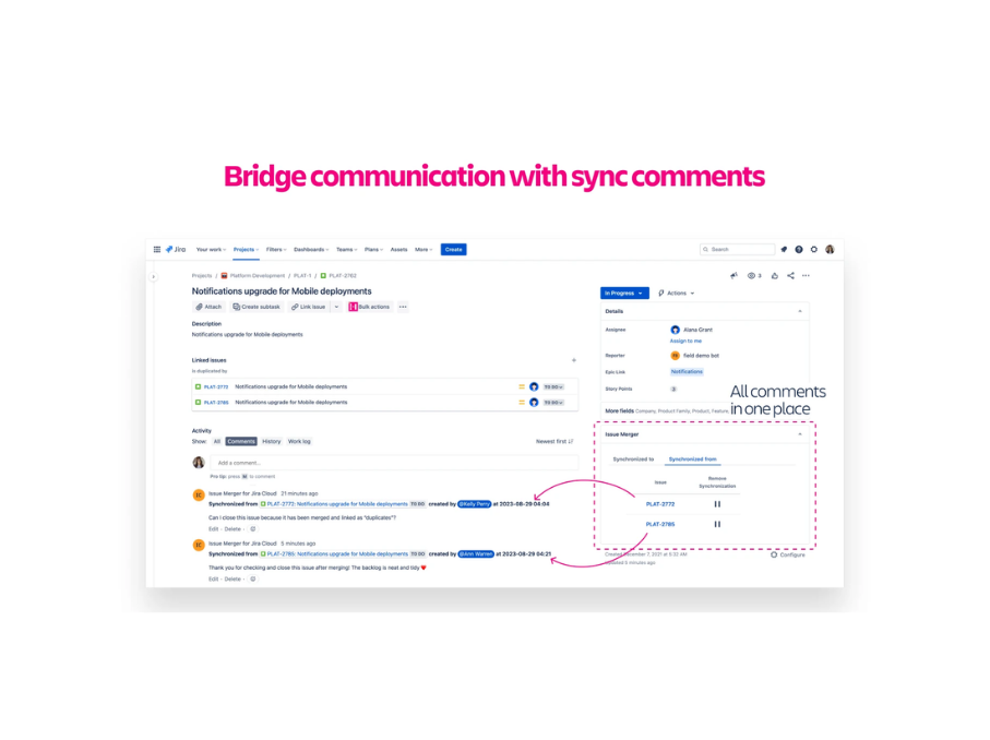 By employing automatic merging via Issue Merger app, similar incidents reported through the Jira customer portal coalesce into a singular, manageable entity. This consolidation ensures all relevant intel—requests and reporter data—is housed in one centralized space hub, enabling support agents to maneuver more efficiently.